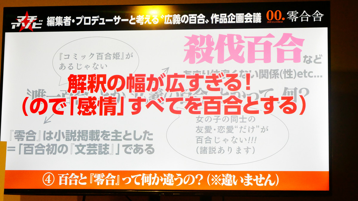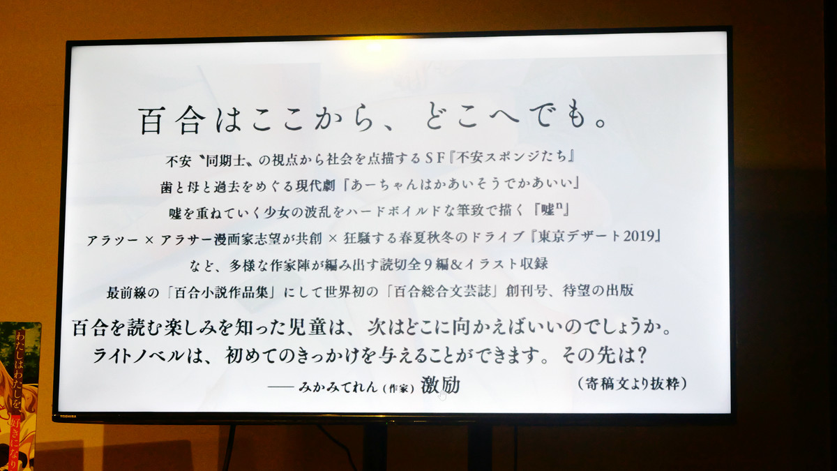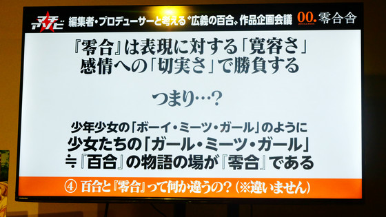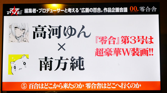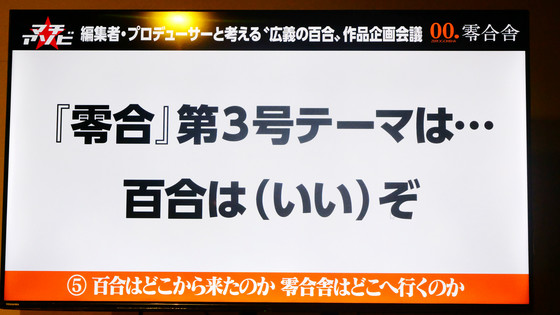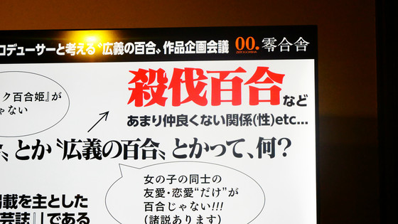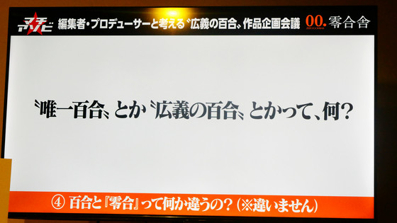 So, let's talk about the topic of today's talk, 'Yuri in the broad sense.' 'The only yuri' means that although there are other media outlets that feature yuri as a theme, such as 'Comic Yuri Hime,' 'Zero' is the only literary magazine that compiles novels and specializes in yuri. The phrase 'yuri in the broad sense' also conveys the idea that 'yuri is not just about friendship and romance between girls.'