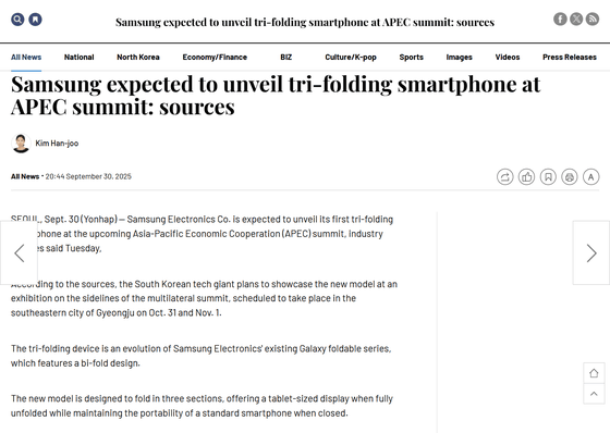 Bloomberg reported that Samsung plans to showcase its first tri-fold smartphone at the Asia-Pacific Economic Cooperation (APEC) summit, scheduled to be held in Gyeongju, South Korea, at the end of October 2025.