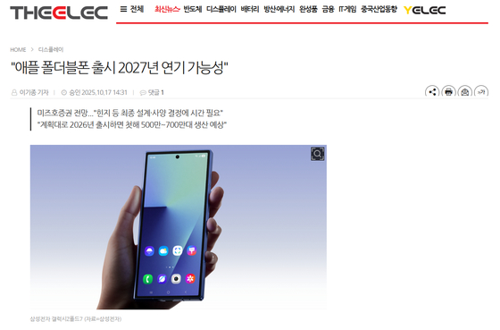 Apple, which is competing fiercely with Samsung in the smartphone market, is also reportedly planning a foldable smartphone. South Korean media outlet The Elec cited a Mizuho Securities report on Apple's foldable iPhone, reporting that 'Apple's final design and specifications, including the hinge, will take time to be finalized, making it difficult to mass-produce the foldable iPhone in the third quarter of 2026 and launch it in September.'