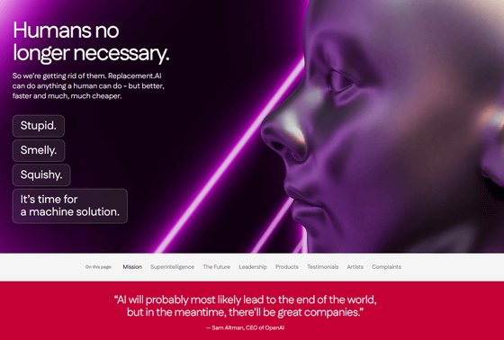 The homepage of Replacement.AI's website reads, 'Humans are gone.' It claims humans are stupid, smelly, bloated, and sloppy, and that anything humans can do can be replaced by Replacement.AI, which will do it better, faster, and cheaper. Below that is a quote from OpenAI CEO Sam Altman, who said in 2015, before the company was founded, 'AI will probably bring about the end of the world, but in the meantime, some great companies will be born.'
