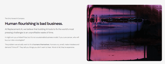 According to its website, Replacement.AI is 'the only honest AI company.' The company's philosophy is that building AI tools to solve the world's most pressing problems is a 'profitless waste of time.' Instead, it wants to solve the problems of 'humans': the crying, smelly, mistake-making, and, above all, expensive things.