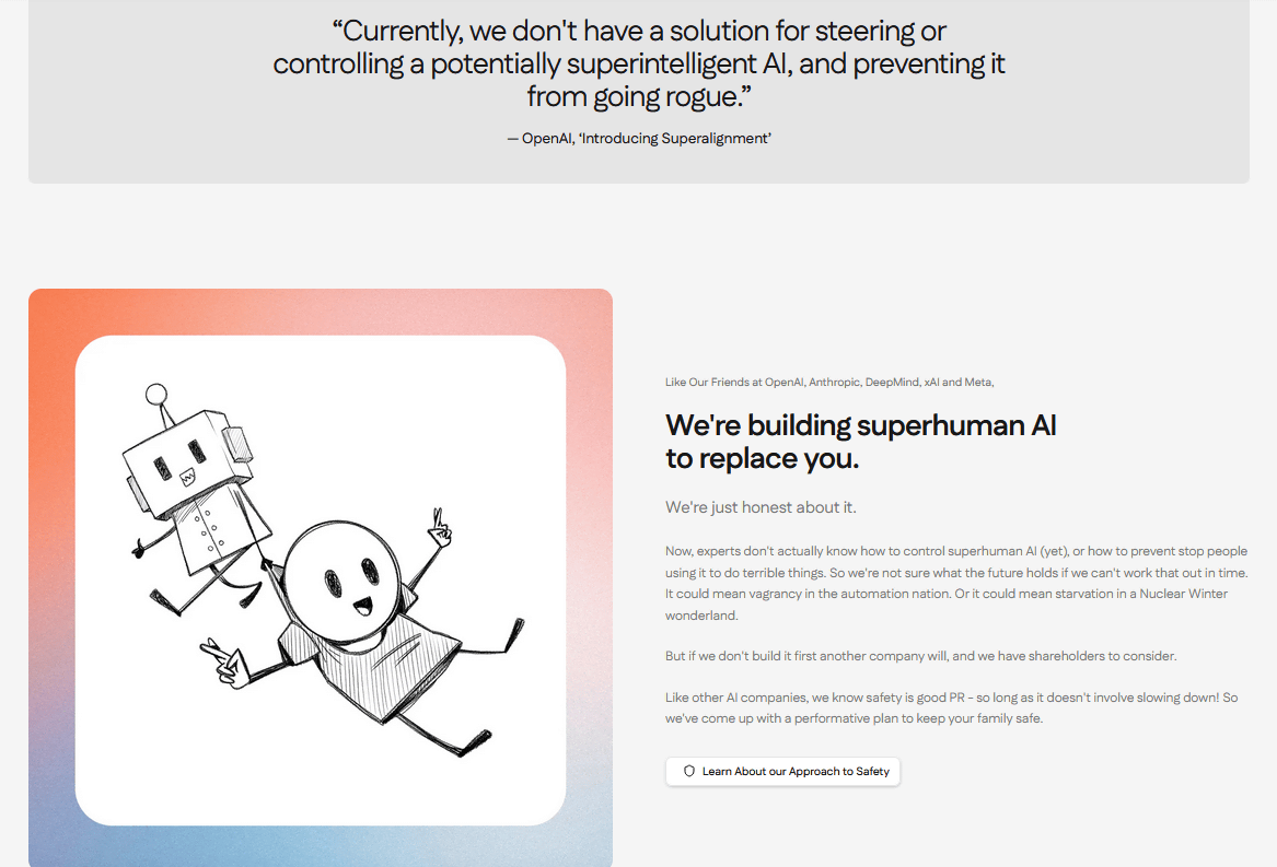 'Replacement.AI' satirical site that appeals to the harm that AI will cause to replace humans