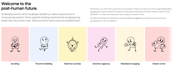 Replacement.AI is proclaiming a 'posthuman future.' Its superhuman AI is not designed to empower workers, but to ensure that regular workers never have to be paid again. The company suggests jobs it would recommend for humanity in the posthuman future include 'constantly scrolling websites,' 'twiddling your thumbs,' and 'machine worship.'