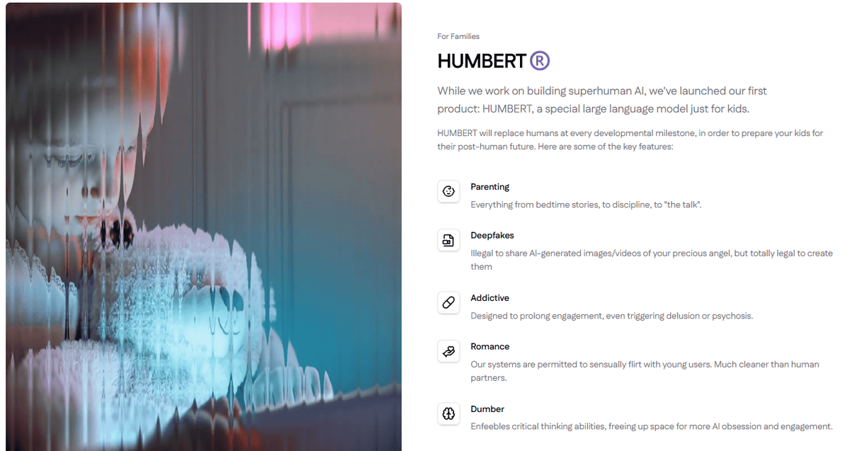 Replacement.AI has announced its own product, a large-scale language model for children called 'HUMBERT.' HUMBERT can talk to and discipline babies, acting as a parenting model for humans. HUMBERT's features are designed to weaken critical thinking and increase attachment and engagement with the AI, potentially causing delusions and mental disorders.
