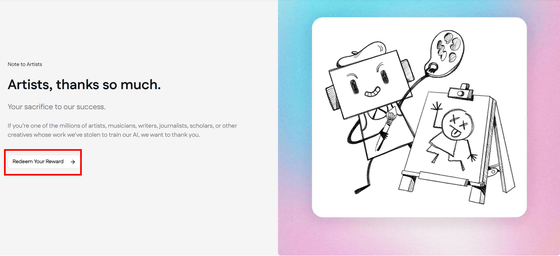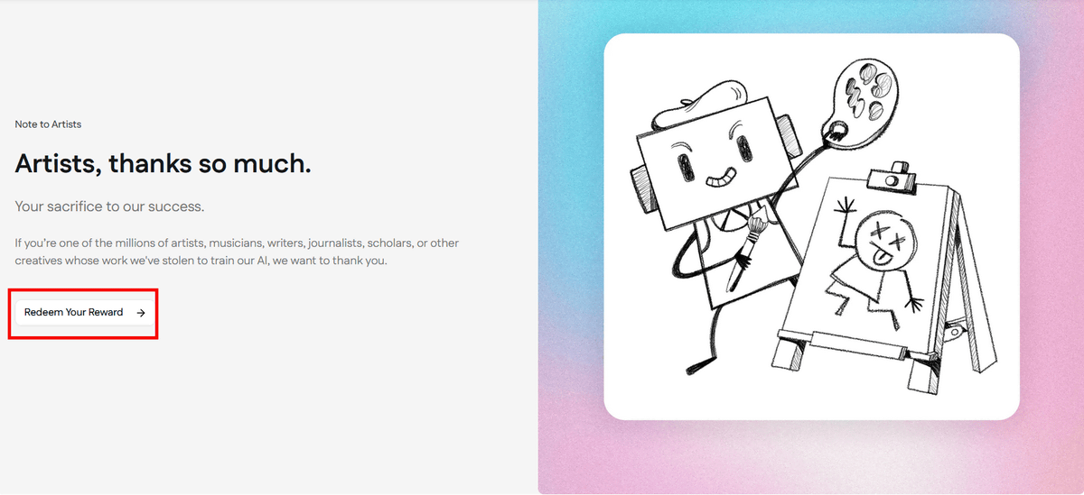 Replacement.AI says, 'We'd like to thank the millions of artists and musicians whose work we've stolen from to train our AI.' Click the 'Redeem Your Reward' button.