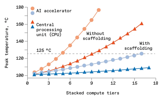 The graph below shows the thermal changes with and without thermal scaffolding for the AI accelerator (circle) and CPU (triangle). The red line shows the results without thermal scaffolding, and the blue line shows the results with thermal scaffolding. With thermal scaffolding, the peak temperature is kept to 125°C.