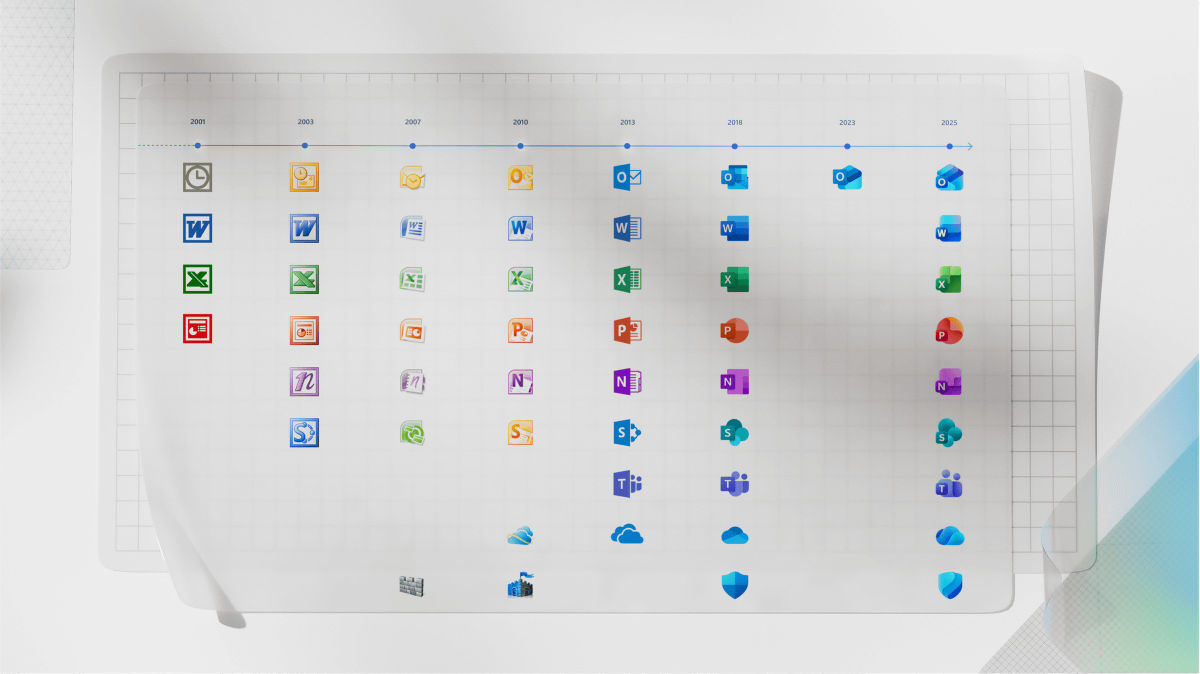 The image below summarizes the evolution of icon designs. While Outlook icons were also changed in 2023, this is the first major change for other Office products since 2018.