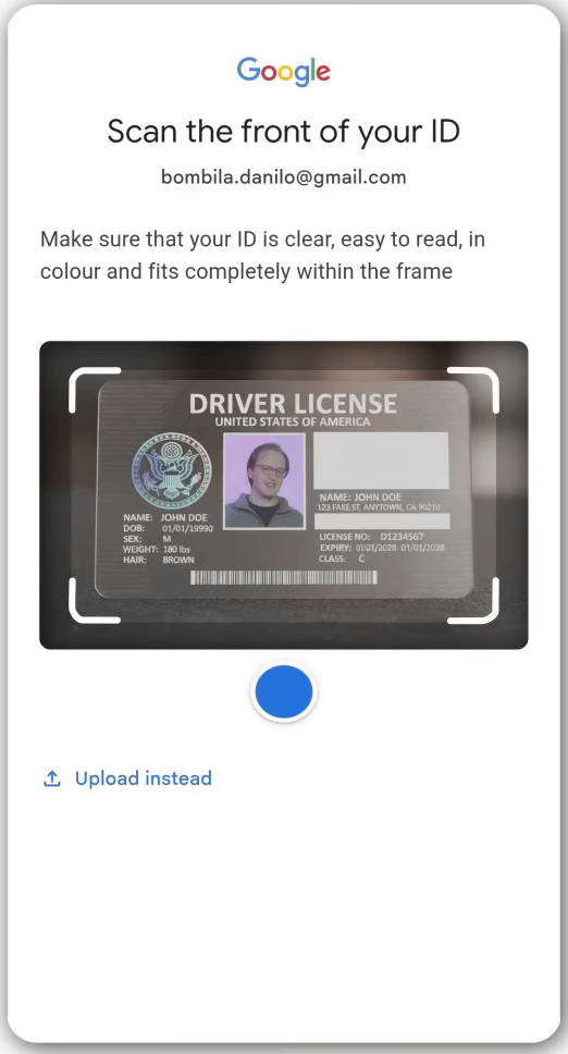 Next, scan your ID. Here we use a driver's license, but other documents should work too.