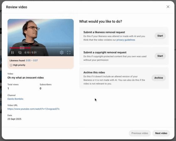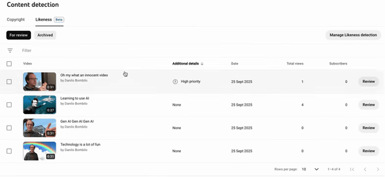 Once you receive the email informing you that it's available, go back to the Similarity Detection tab and you'll see a list of videos that YouTube has determined to be 'similar to the registered portrait.'