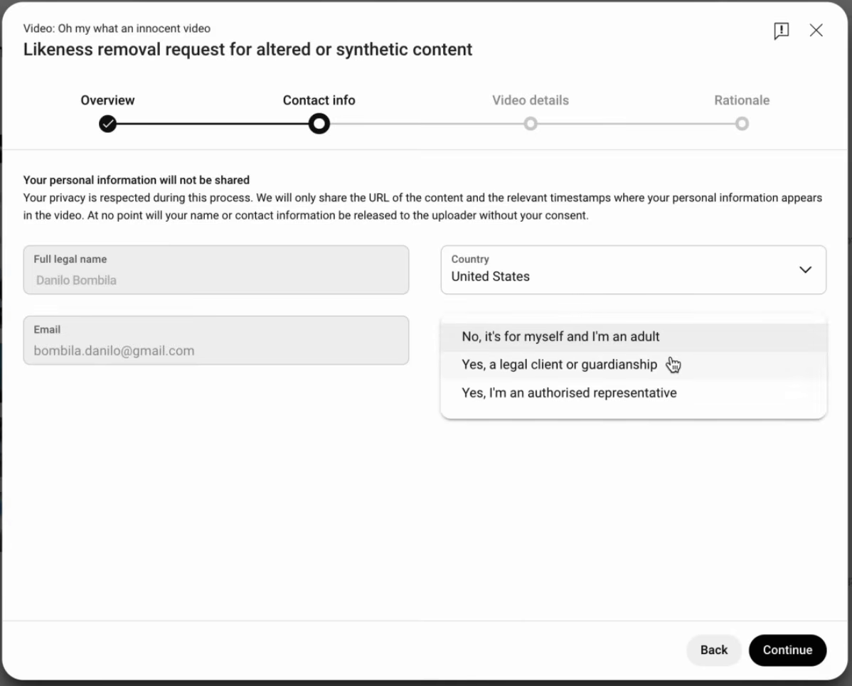 Since you have already registered your name and email address, you will now need to register your country information and the relationship between the content and the applicant. There are three options for the relationship: 'Self and adult,' 'Legal client or guardian,' and 'Authorized representative.' If you select something other than yourself, a field will appear where you can enter the applicant's name and specific relationship.