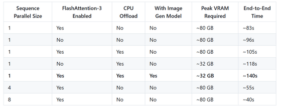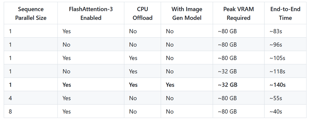 It is open source and can be used for free by configuring your own environment. The minimum GPU memory requirement is 32GB, but a model quantized to FP8 can run on 24GB of memory. The end-to-end time for generating a 121-frame, 720x720 video with 50 levels of noise reduction is less than 40 seconds.