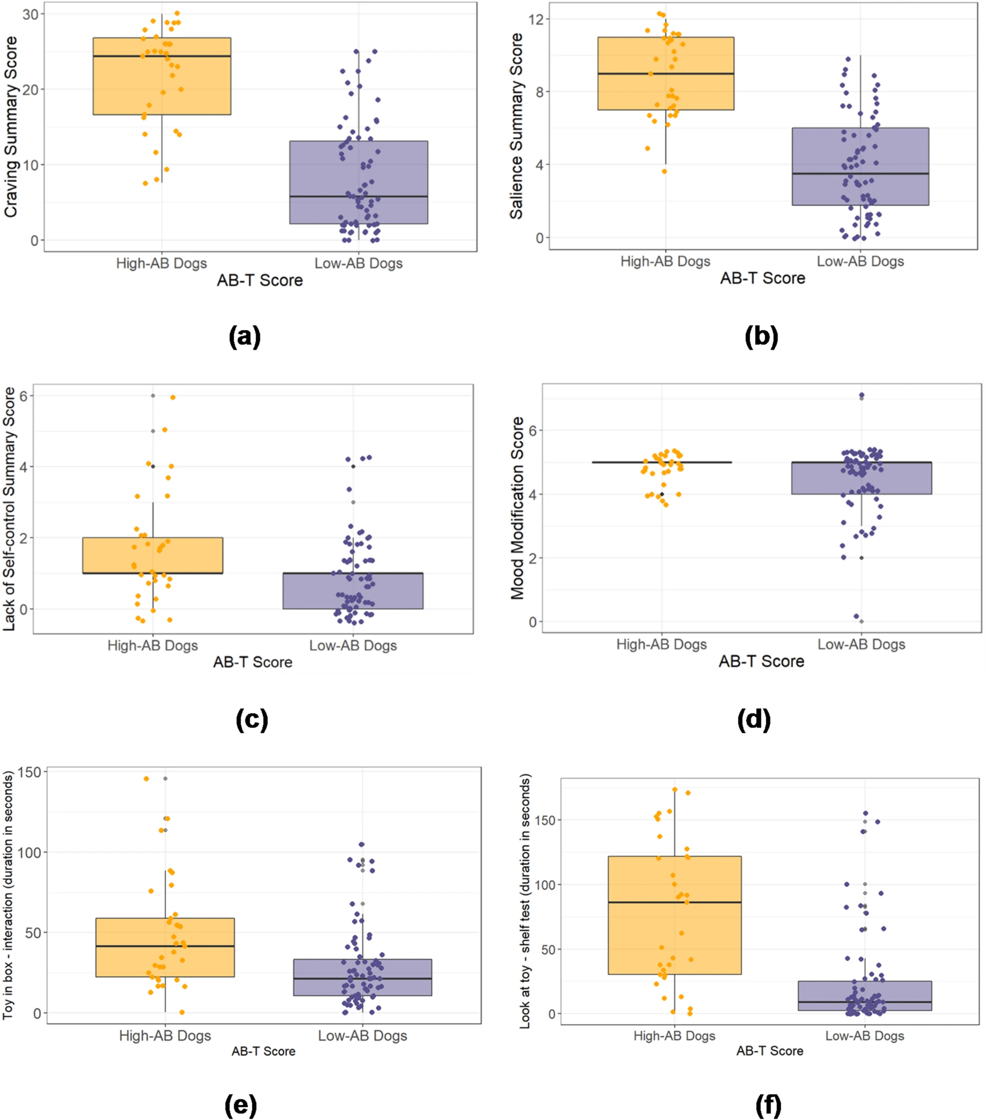 For further analysis, the scores compiled for each behavioral addiction criterion were compared, and high AB dogs showed significantly higher scores than low AB dogs, particularly in ' craving (a) ,' ' salience (b) ,' and ' lack of self-control (c) .' These results indicate that dogs with excessive motivation for toys exhibit behaviors that are typical of behavioral addiction. On the other hand, no significant difference was found for ' mood changes (d). ' This may be because high AB dogs are only as excited about toys as low AB dogs, or that behavioral addiction may transcend the simple enjoyment of play.