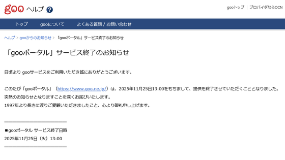 Goo Mail is scheduled to end its service on Wednesday, February 25, 2026. New applications have already been suspended as of August 1, 2025, and users will be advised to switch to OCN Mail or other services after the service ends. After the service ends, users will no longer be able to use their goo email address.