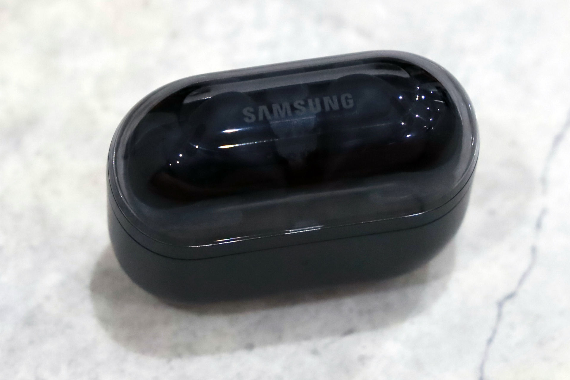 The lid of the charging case is made of clear plastic, allowing you to see the earphones inside, and it also has the Samsung logo on it.