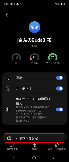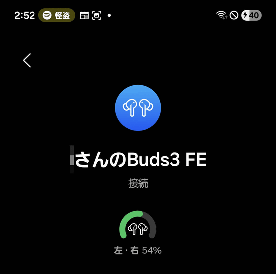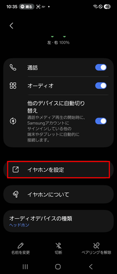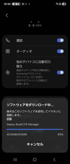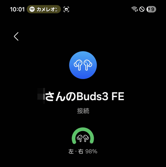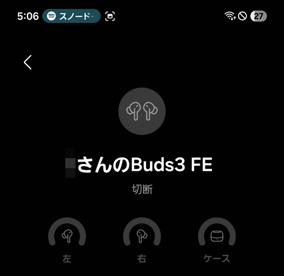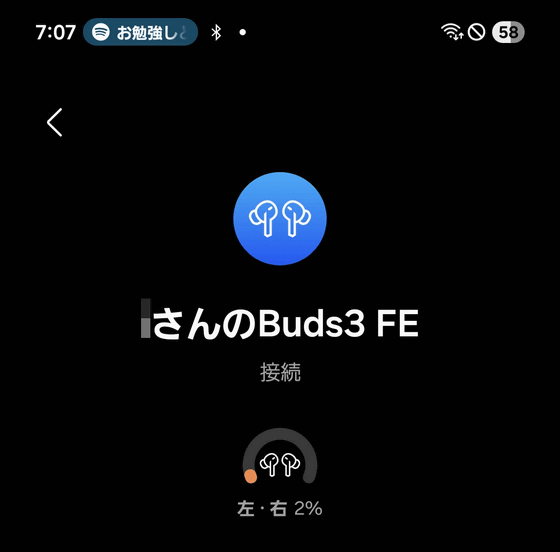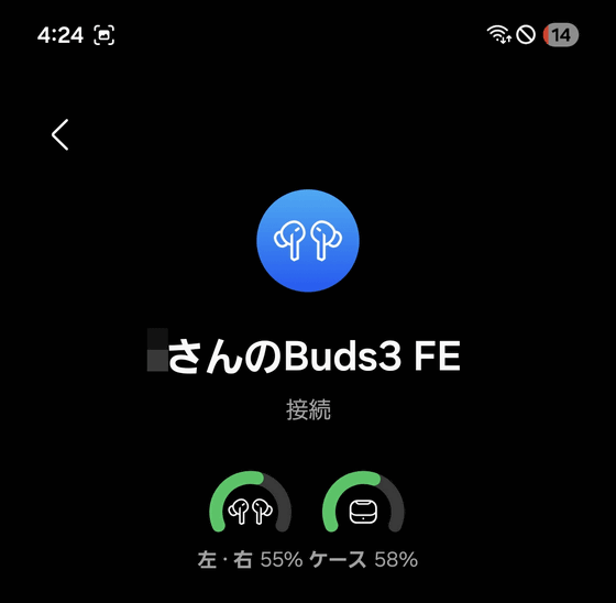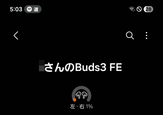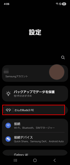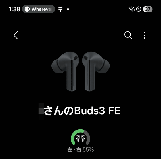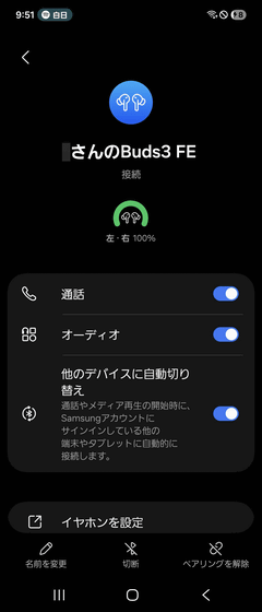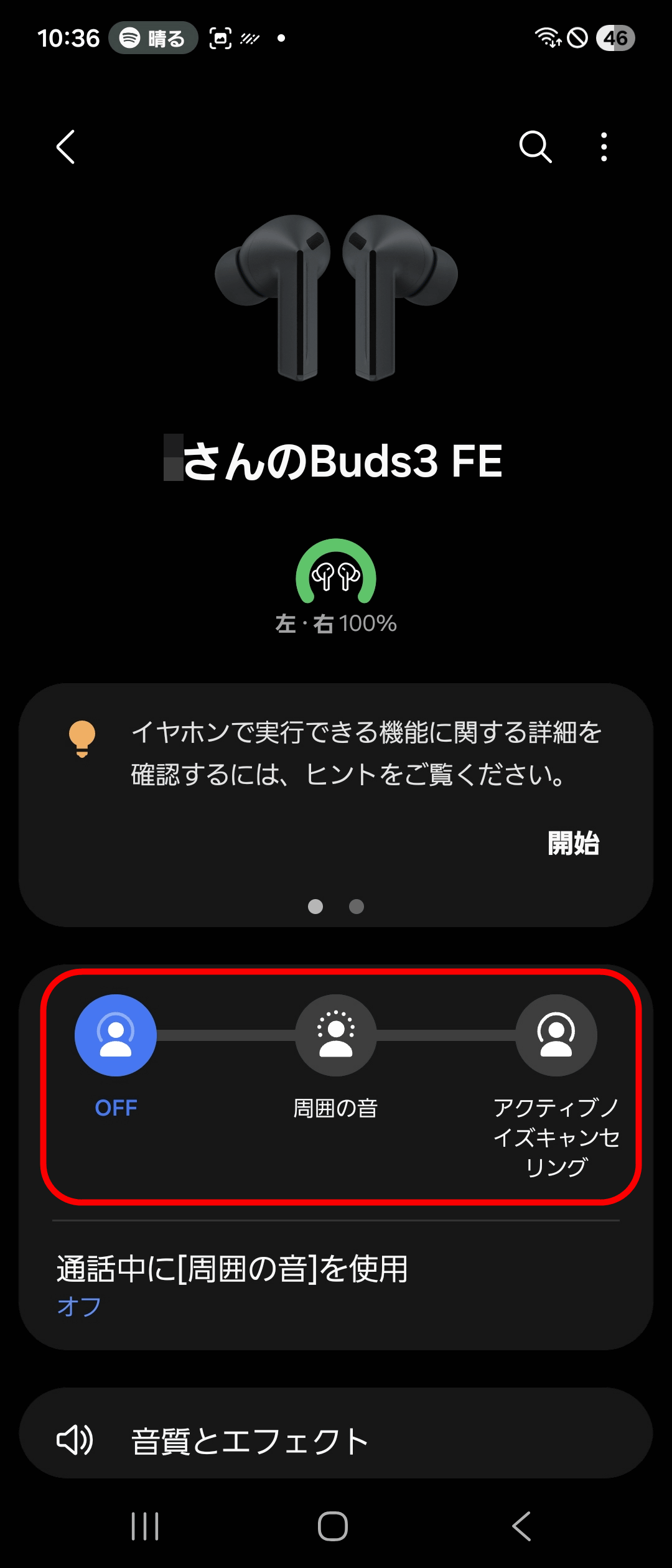 Since active noise cancellation is off by default, we first tested how long music could be played with it off. You can check the remaining battery life of the Galaxy Buds 3 FE from the '(Username)'s Buds 3 FE' screen in the Settings app.