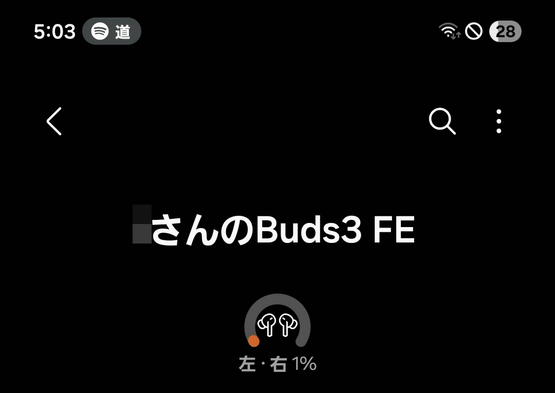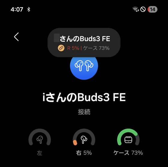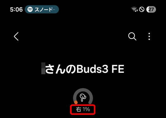 Next, I charged the empty Galaxy Buds 3 FE battery. When I put the Galaxy Buds 3 FE, which had 0% battery and could no longer connect, into the charging case, the following notification immediately appeared: The first battery level to be displayed was the right earbud, which had 5% battery remaining.