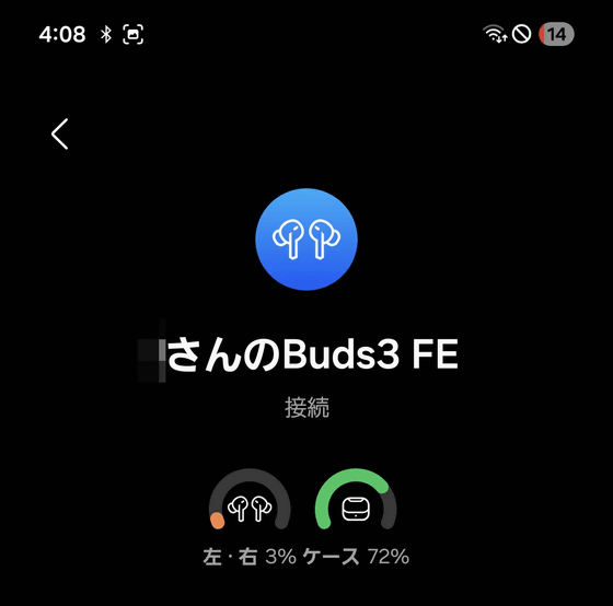 When I placed the Galaxy Buds3 FE in the charging case, the remaining battery level of the charging case was displayed.