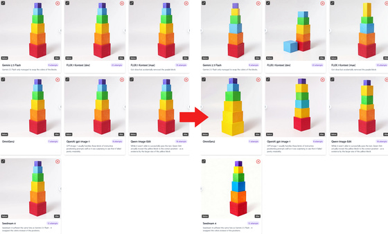 In addition, when an image of five stacked blocks was altered with the prompt 'Swap the positions of the blue and yellow blocks,' none of the AIs were able to swap just two blocks. According to the site, by making all the blocks in the original image different sizes, the 'prompting trick' of replacing the task of swapping blocks with the simple task of 'swapping colors' was prevented, increasing the difficulty.