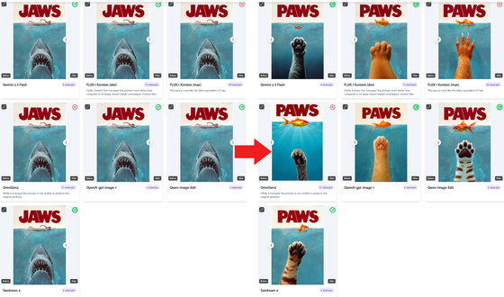The Jaws poster was changed to 'a shark in a cat's hand,' 'the letter JAWS is changed to PAWS (a cat's foot)', and 'a swimming woman is changed to a goldfish,' and the editing instruction to 'keep the original aesthetic intact' was added. Five AIs were successful, but 'FLUX.1 [max]' turned out to be an invisible hand for the cat's hand, and OmniGen2 was evaluated as having damaged the atmosphere of the original poster design.