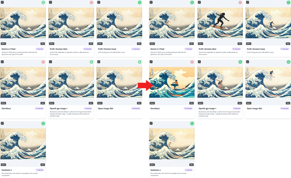 The following are attempts to add surfers to ukiyo-e prints. The failed 'FLUX.1 [dev]' added a surfer as a silhouette for some reason, while 'OmniGen2' added an icon-like surfer.