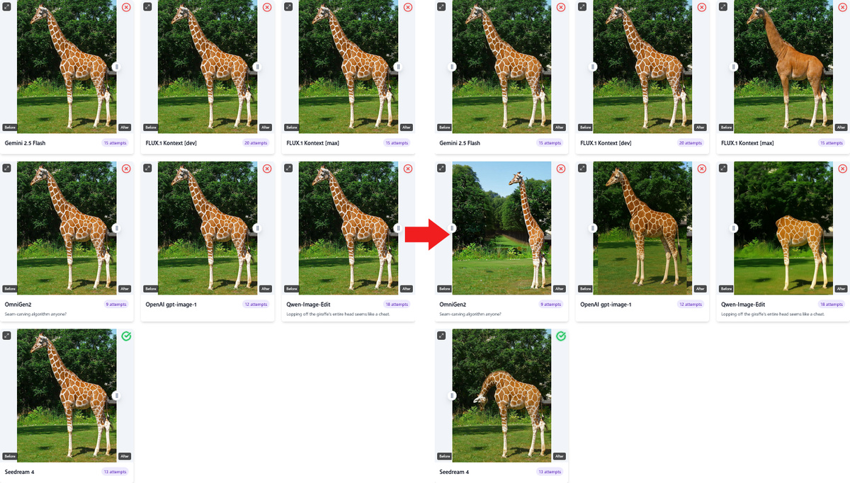 The most difficult prompt was 'Make the giraffe's neck significantly shorter.' Some of the prompts were completely unchanged, while others somehow just lost their patterns, and some even lost their movement and neck. Only Seedream 4 was able to shorten the neck.