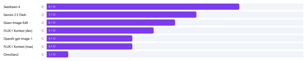 At the time of writing, the seven AIs used in the GenAI Image Editing Showdown are ' Gemini 2.5 Flash ,' 'FLUX.1 Kontext [dev],' 'FLUX.1 Kontext [max],' VectorSpaceLab's ' OmniGen2 ,' OpenAI's ' gpt-image-1 ,' Alibaba's ' Qwen-Image-Edit ,' and ByteDance's ' Seedream 4. '