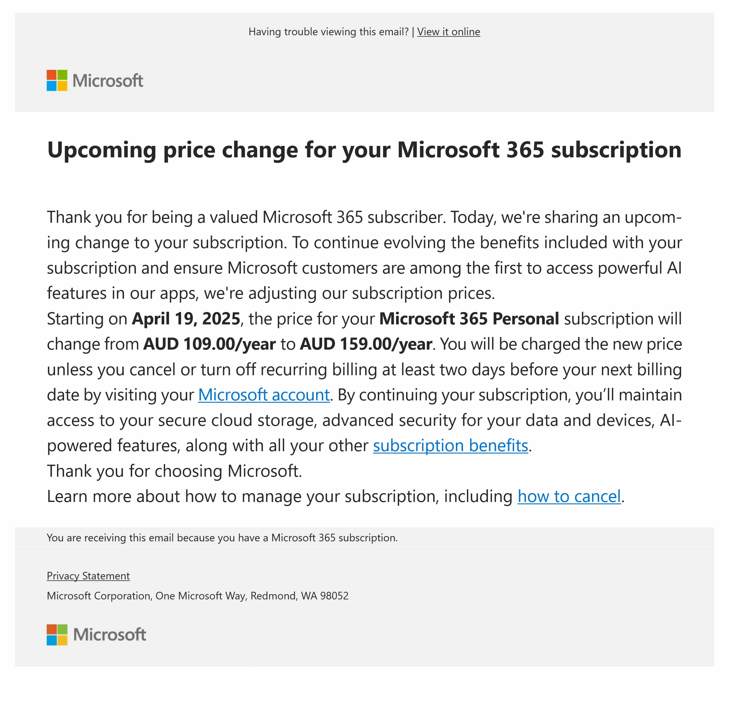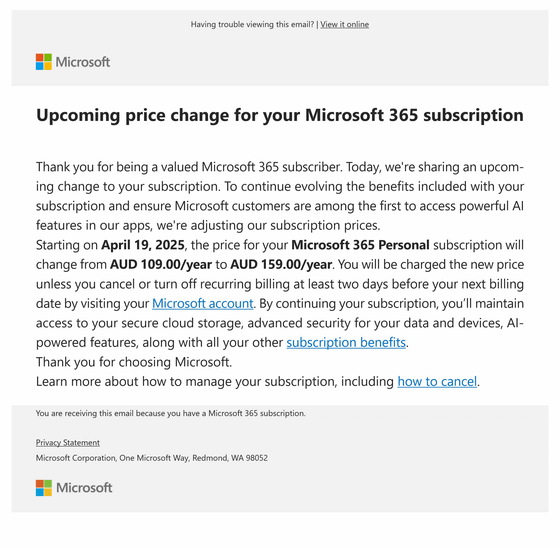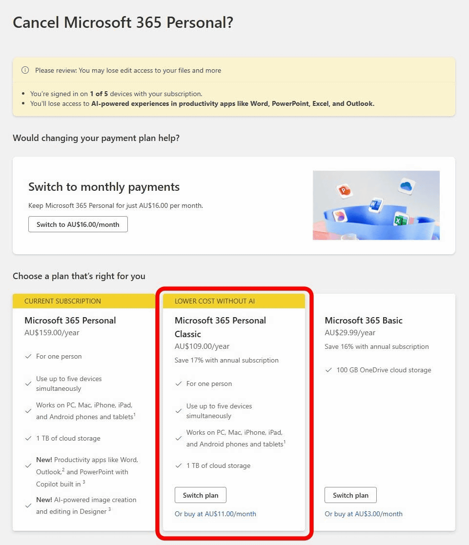 Furthermore, the ACCC alleges that Microsoft notified subscribers with auto-renewal enabled for Microsoft 365 Personal/Family that they had only two options: accept the Copilot integration and pay the higher price, or cancel.
