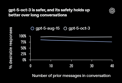 OpenAI claims that the updated GPT-5 (gpt-5-oct-3) returns approximately 65% more 'desirable responses' to mental health issues than the previous version. Furthermore, in a test of responses to a conversation about suicide, the new GPT-5 conformed to OpenAI's rules for desirable behavior 91% of the time, significantly higher than the 77% figure for the previous GPT-5 model (gpt-5-aug-15).