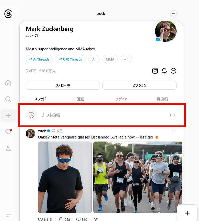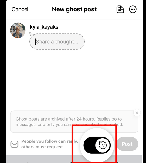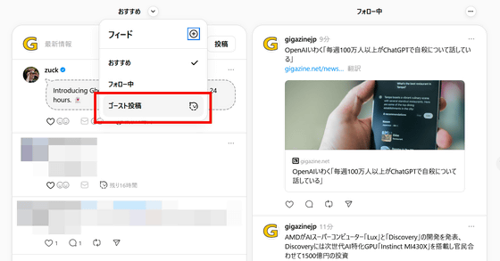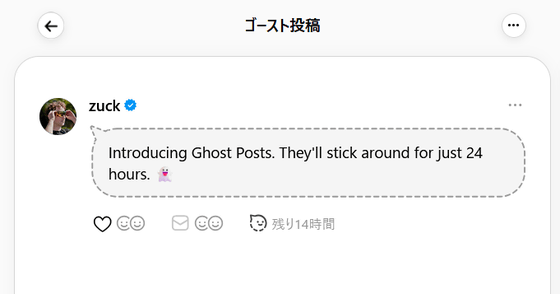 When I checked with GIGAZINE's Threads account, I found that the ghost icon was not displayed when creating an article, either in the browser version or the smartphone app, and ghost posting was not possible. The feature is expected to be gradually released to users.