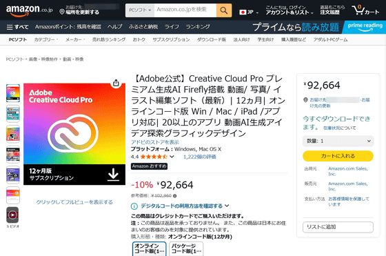 Creative Cloud Pro, which allows you to use more than 20 Creative Cloud apps such as Photoshop, Illustrator, Creative Cloud Express, Premiere, and Acrobat Pro, is available for 9,080 yen per month (tax included), and a 12-month plan is available on Amazon.co.jp for 92,664 yen (tax included).