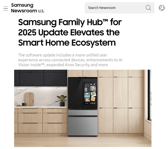 Around September 16, 2025, Samsung notified Family Hub users of an update stating, 'Ads will be displayed to improve our service and provide additional content.' Jeong Seung-moon, executive vice president of Samsung's digital home appliance business and head of the research and development team, commented in April 2025 that 'we have no plans to include ads.' Since Family Hub is an expensive refrigerator with models ranging from $1,800 (approximately 260,000 yen) to $3,500 (approximately 510,000 yen), many people have criticized it, saying, 'Samsung is trying to make more profit from products already purchased.'