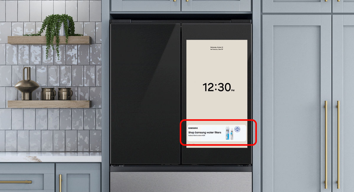 Samsung says Family Hub's ads are impersonal and 'contextual,' and that Family Hub does not collect personal information or track consumers.