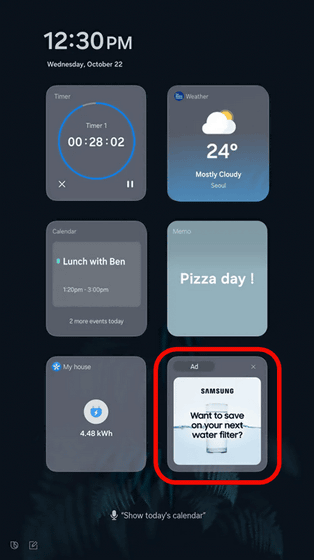 The widget that actually displays the ad looks like this: On the cover screen when you're not operating the Family Hub display, the widgets in about a quarter of the space at the bottom of the screen switch every 10 seconds, displaying 'Calendar appointments,' 'Weather forecast,' 'News,' and 'Advertisements.'