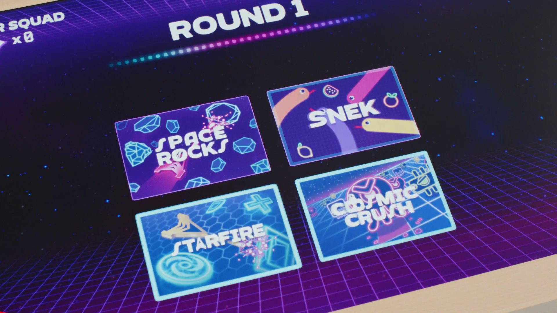 A mode that randomly plays four games: 'SPACE ROCKS,' 'SNEK,' 'STARFIRE,' and 'COSMIC CRUSH.'