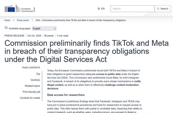 If the EC finds that these companies are in violation of the Digital Services Act, it can impose fines of up to $1 billion (approximately 150 billion yen) on each company, but the companies will be given an opportunity to defend themselves before doing so. A Meta spokesperson stated in an email to Science that the company has already taken the necessary steps to comply with the Digital Services Act. A TikTok spokesperson said the company is reviewing the EC's findings but pointed out that the Digital Services Act's data-sharing requirements are inconsistent with EU privacy regulations.
