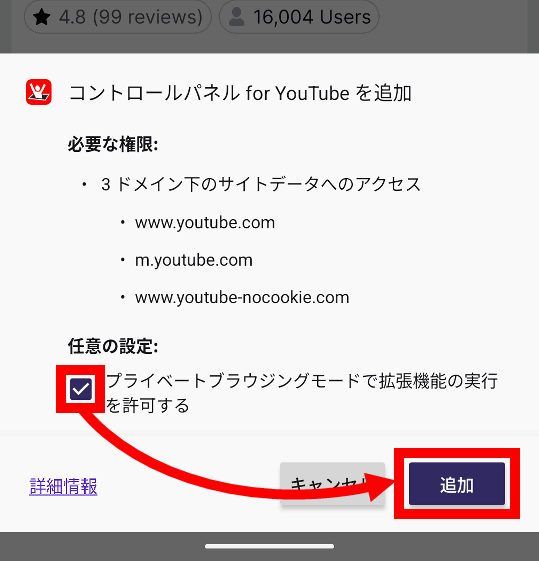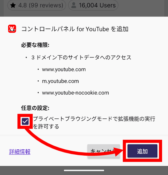 When the following screen appears at the bottom of the screen, tap 'Add.' If you want to use it in private browsing mode, check 'Allow extensions to run in private browsing mode' and then tap 'Add.'