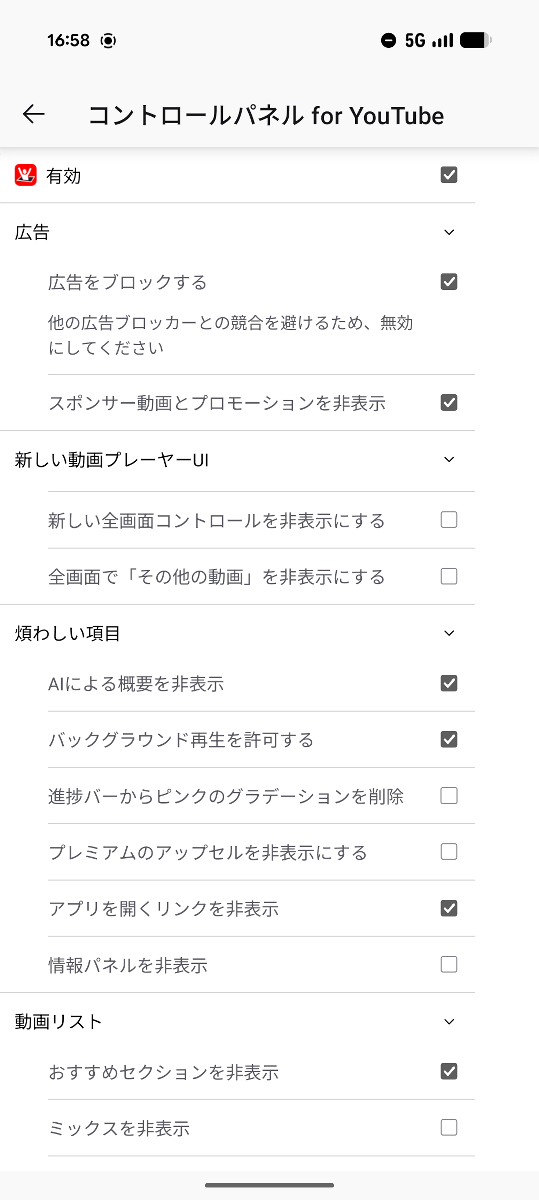A large number of features are displayed, and you can enable or disable each one individually. In addition to background playback, you can also use convenient features such as 'Block Ads,' 'Hide Sponsored and Promotional Videos,' 'Hide AI Summary,' 'Hide Movies and TV,' and 'Hide Members-Only Videos.'