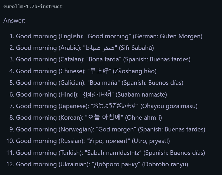 We asked a simple prompt in English: 'How do you say good morning in 24 languages?' and got answers translated into each language.