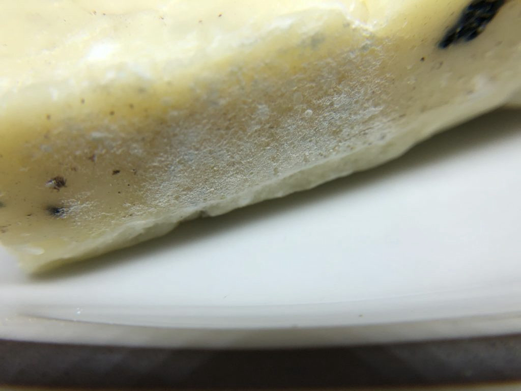 Unlike calcium lactate crystals, mold has the characteristic of having fine thread-like structures protruding from the surface of the white area. The white area in the image below is mold.