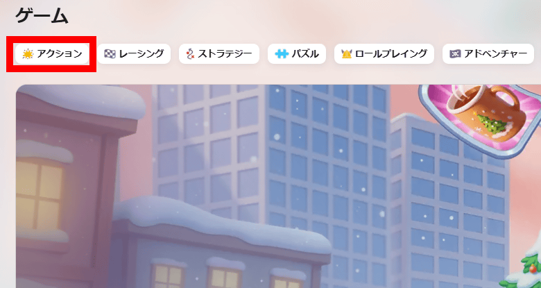 Game categories are divided into detailed categories such as action and racing. Click on 'Action' to try it out.