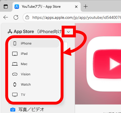 The web version of the App Store has separate pages for each supported device, and by default it displays apps for iPhone. Click the '∨' in the upper left corner of the screen to select the supported device: iPhone, iPad, Mac, Vision, Watch, or TV.