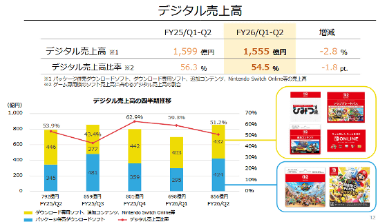 Digital sales for April to September 2025 were 155.5 billion yen, down 2.8% compared to the same period last year.