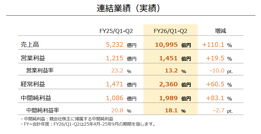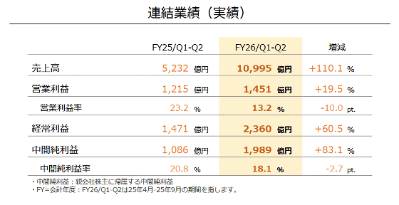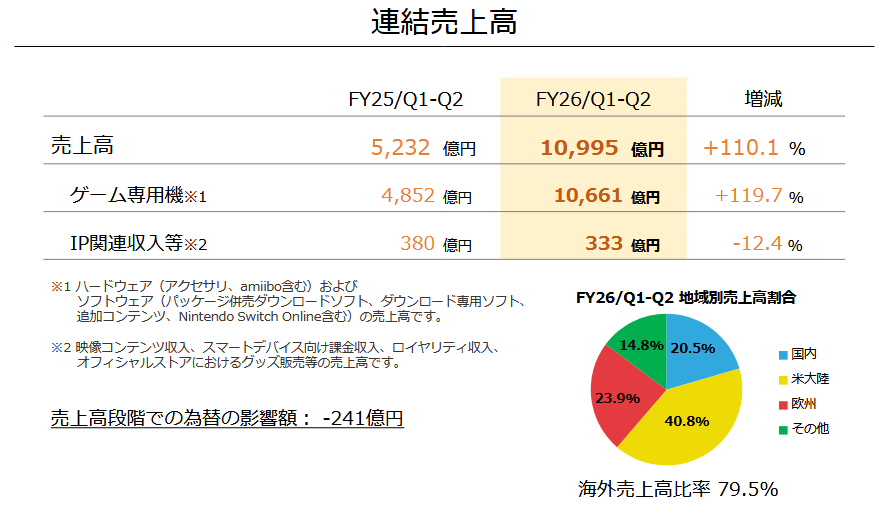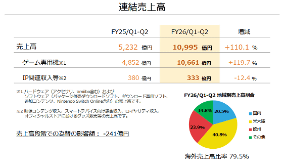 Nintendo's sales for April to September 2025 were 1.0995 trillion yen, an increase of 110.1% compared to the same period last year, and its operating profit was 145.1 billion yen, an increase of 19.5%.