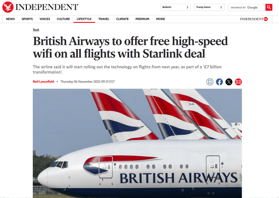 British Airways announced that it plans to introduce Starlink on board its aircraft from 2026 as part of a 7 billion pound (approximately 1.4 trillion yen) transformation. Passengers will be able to use Starlink on board regardless of which cabin they are in, without any special login required.