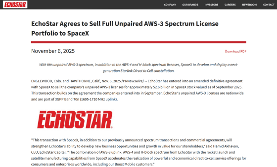SpaceX also reported that the number of customers worldwide will exceed 8 million in November 2025, and announced that it will purchase radio frequency licenses worth $2.6 billion (approximately 400 billion yen) from EchoStar , a US company that provides satellite communications and internet services.