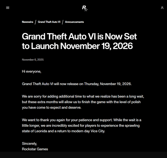 On November 6, 2025, Rockstar Games, the developer of GTA 6, announced that the game's release date would be delayed to November 19, 2026. Rockstar Games stated, 'We apologize for the long wait, but we believe that delaying the release for several months will allow us to deliver a high-quality game that meets all of your expectations. We would like to thank you again for your understanding and support. Although this will require a short wait, we look forward to players experiencing the vast world of Leonida and our return to modern-day Vice City.'