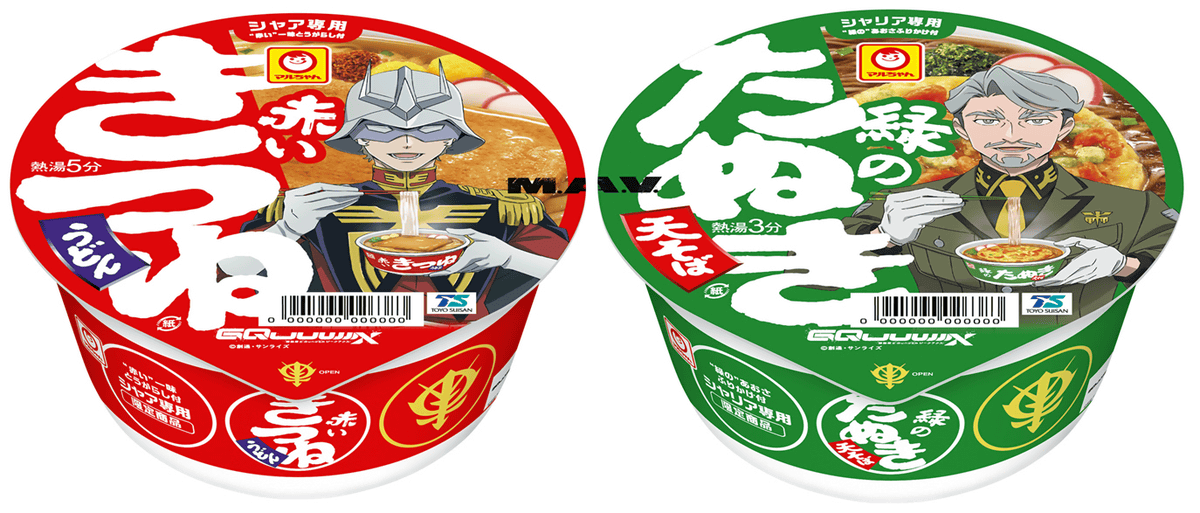Toyo Suisan's 'Red Fox' and 'Green Tanuki' cup noodles will be released as a collaboration between the anime 'Mobile Suit Gundam GQuuuuuX' and the anime series ' Maruchan Char's Red Fox Udon ' and ' Maruchan Char's Green Tanuki Ten Soba ' on Monday, November 17, 2025. The packaging features Char Aznable and Sharia Bull, respectively, and when the two packages are joined together, they spell out 'MAV.' The suggested retail price for each product is 236 yen (excluding tax).