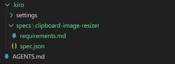 A .kiro folder will be created, and inside it will be a folder with the abbreviation for this feature, 'clipboard-image-resizer,' and a 'requirements.md' file for managing specifications.
