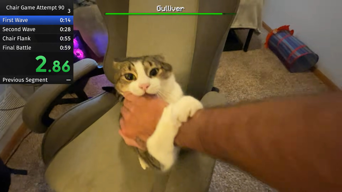 The channel's oldest post, ' Literally 1 Minute 35 Seconds of Annoying a Cat ,' features Gulliver shaking his finger or bringing a toy near him, filming him reacting annoyed. This was followed by a video in February 2025 titled 'Any% (WR) Speedrun: Annoying a Cat Until It Leaves Its Chair.' While there was a previous video titled ' Annoying a Cat Until It Leaves Its Chair ,' this one featured a timer, making it a speedrun. 'Any%' is a term used in game speedruns, referring to completing a game as quickly as possible without regard to completion percentage, rather than '100%,' which refers to completing the game by collecting all items and stage elements.