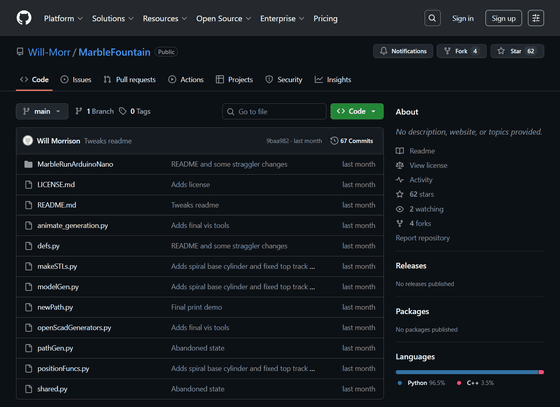 Morrison says the prototype for Marble Fountain was completed quickly. The process for creating Marble Fountain is very simple: first, randomly place points. Then, draw smooth curves to connect each point and set a constant slope. This was too simple, so in order to add more parts, he created a 'path solver' program to simulate the path the balls would roll.